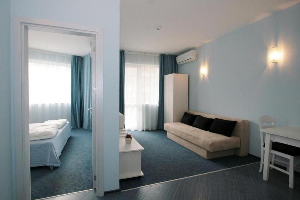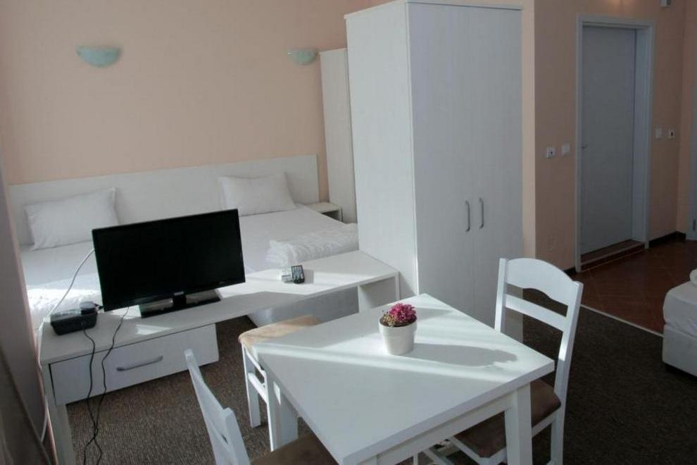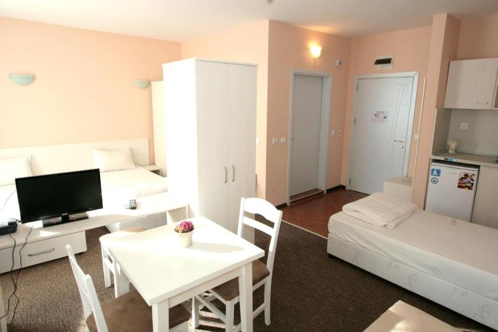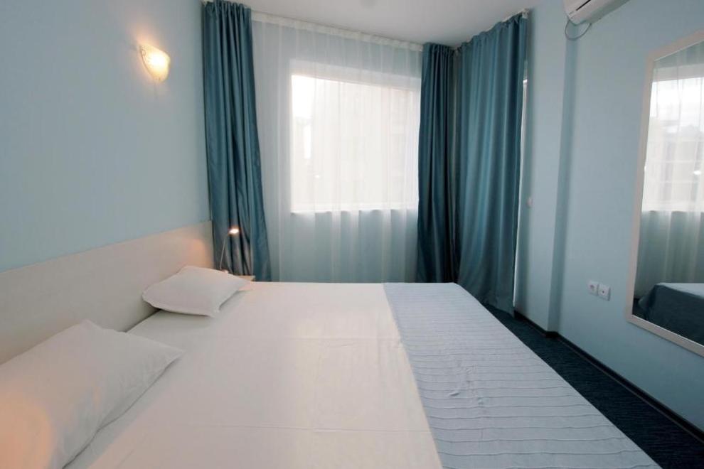 Хотелът е пететажен (с три асансьора) и разполага с общо 62 помещения за настаняване. Всяка стая е с луксозно обзавеждане, в т.ч.: две отделни легла тип „френски“ (200х100 см) – събрани или разделени; разтегателен диван, бюро, гардероб, куфарник; кухненски бокс с хладилник, маса и три стола, а така също – климатици „Panasonic“ (по 2 бр. – в апартамент и 1 бр. – в студио), LCD телевизор с кабелна телевизия; телефон. Осигурен е безплатен WI-FI във всяко помещение. Всяка стая разполага с отделен балкон с маса, два стола и сушилник за дрехи. Санитарните възли са оборудвани с тоалетна, умивалник, душ-кабина, сешоар, телефон и аксесоари.